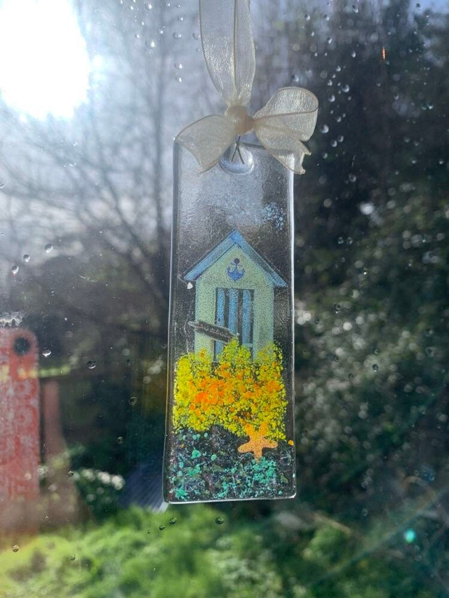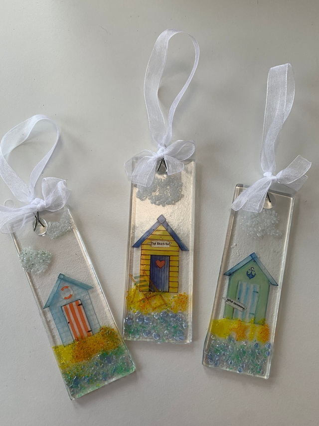 These beautiful hand crafted fused glass suncatchers capture the iconic seaside image of a beach scene with beach hut. They are made in our studio overlooking the Devon coast, using a mixture of single layer glass, glass powders and frit, and water slide decals, lightly fused to the surface creating a tactile and beautifully contoured finished piece. Each is unique so please message us if you are after a specific one, otherwise we will choose one for you.