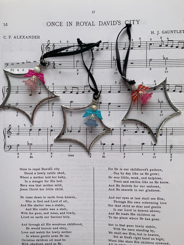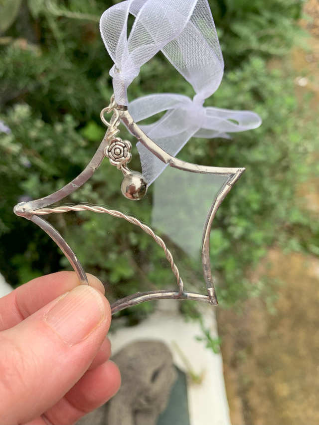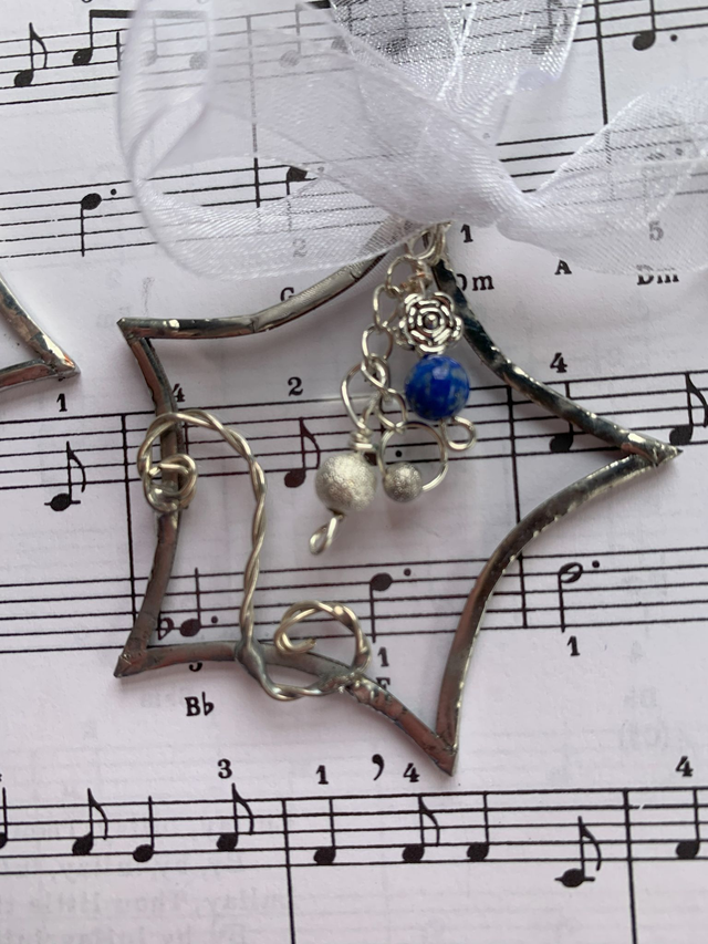 Made using upcycled clear glass, each 4 to 5cm star is copper foiled and soldered before the decorative touches are added. Each is individual and will not be repeated.