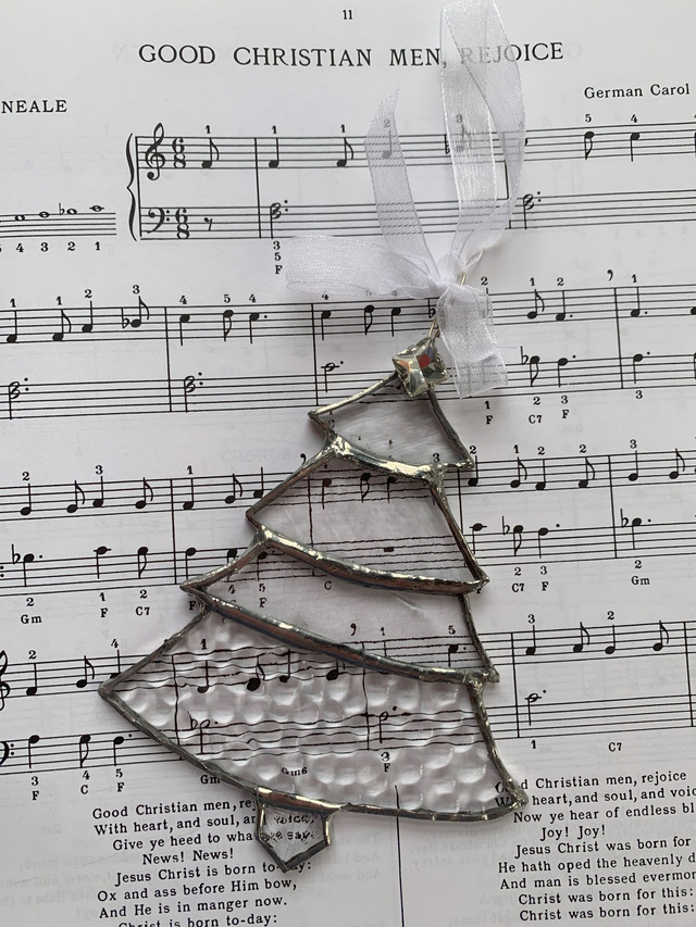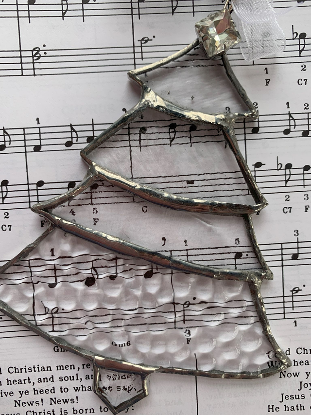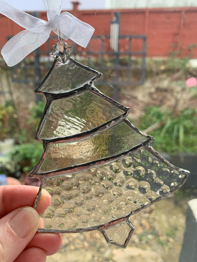 This clear glass Christmas tree shaped copper foiled decoration has a sparkling jeweled 'star' at the top of the tree. Using stacked textured clear glass each layer is soldered to the next to create this 9cm elegant and unique design.