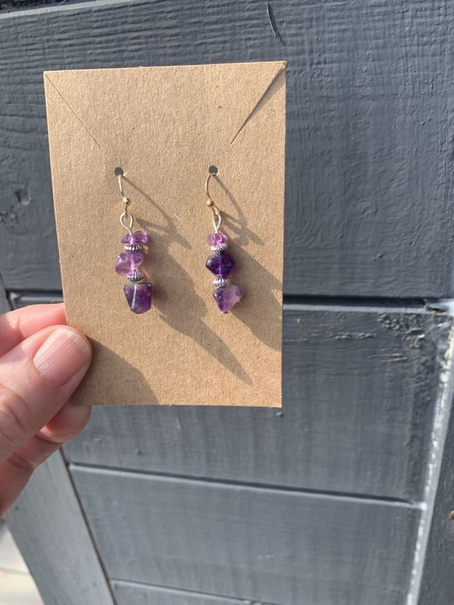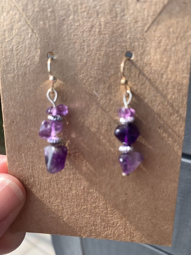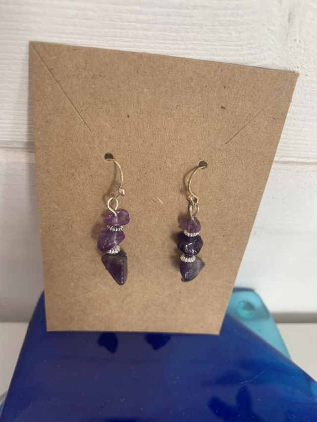 These pretty violet amethyst chips have been elegantly linked with silver coloured beads to create hand crafted classic core drop earrings. They were made in our studio overlooking the Devon coast, using silver plated hooks. Amethyst can be a powerful and protective stone and it relieves stress and strain, soothes irritability, balances mood swings, dispels anger, rage, fear and anxiety. It is also said that Amethyst alleviates sadness and grief, and dissolves negativity.