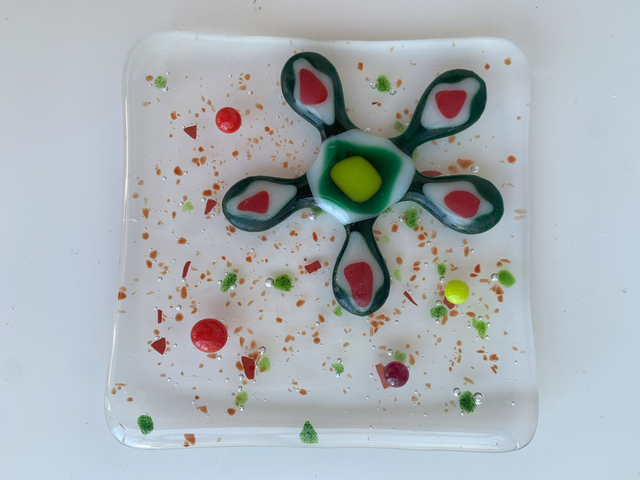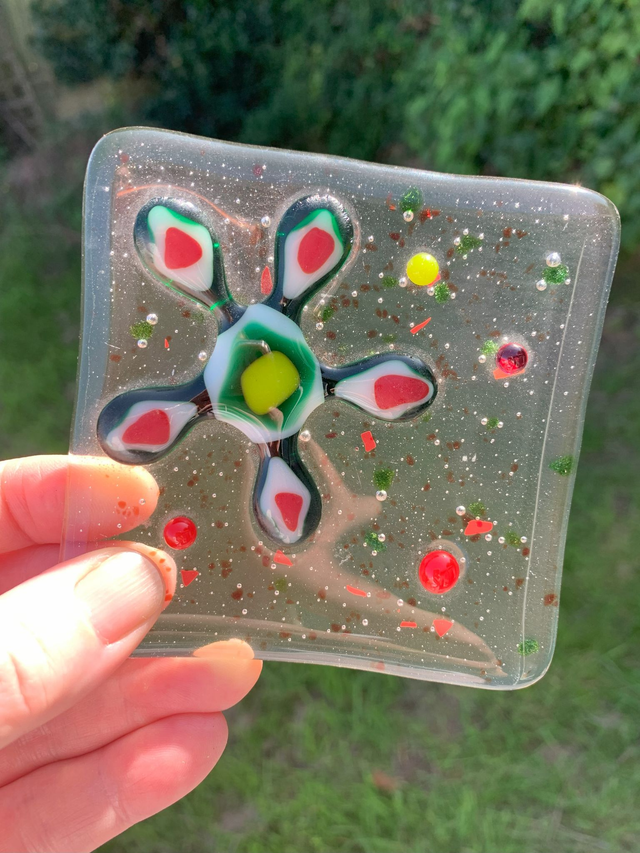 Beautiful hand crafted fused glass 9.5cm square shallow dish featuring an unusual raised glass flower in black, red, yellow and green. A gift suitable for any occasion that looks and feels amazing, and makes a gorgeous addition to any home.