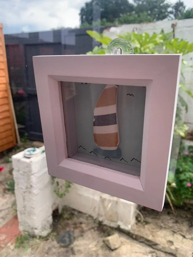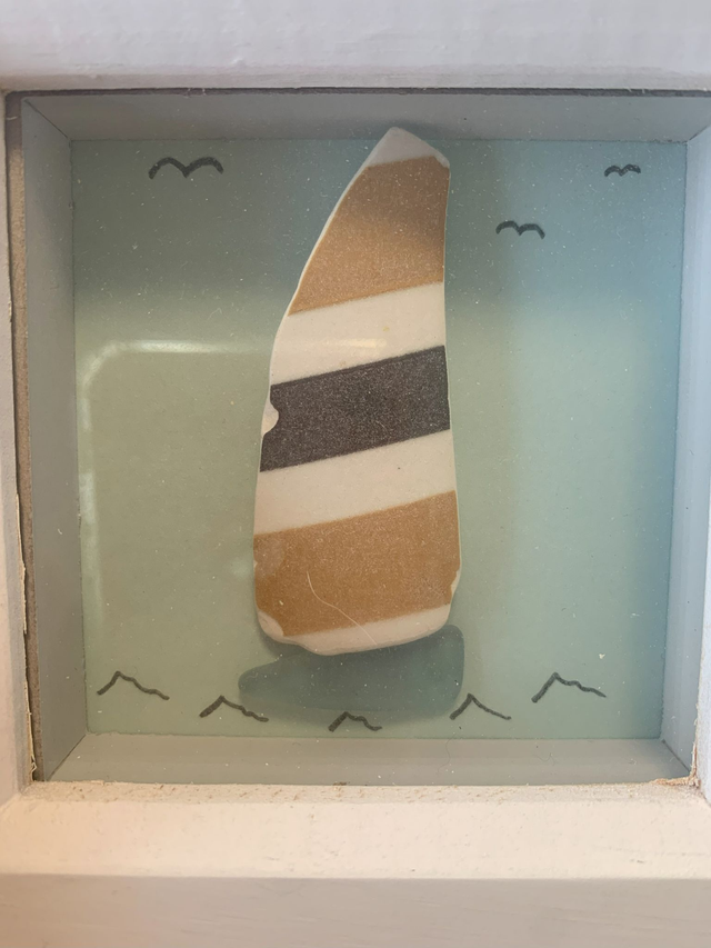 Found Sea Glass and Pottery Sail Boat Picture in Deep Frame approx. 11.5cm x 11.5cm (230204)