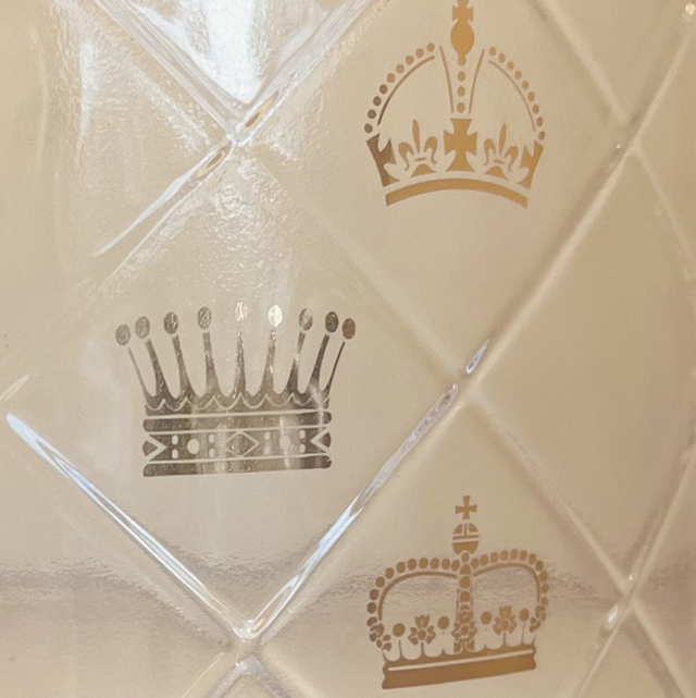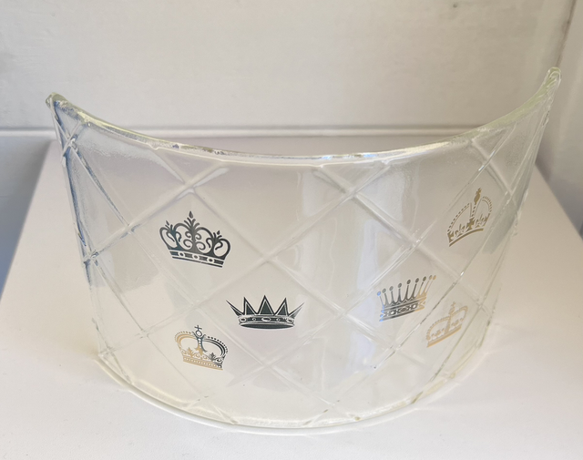 A sculptural fused‑glass curve featuring delicate 23ct gold crowns on kiln‑formed glass, textured with clear glass stringers. The transparent form catches and bends the light, while the metallic accents create a regal shimmer that shifts as you move around the piece. Its flowing shape and embedded gold details give it a contemporary, luminous presence—perfect as a standalone artwork or a striking addition to a curated display.