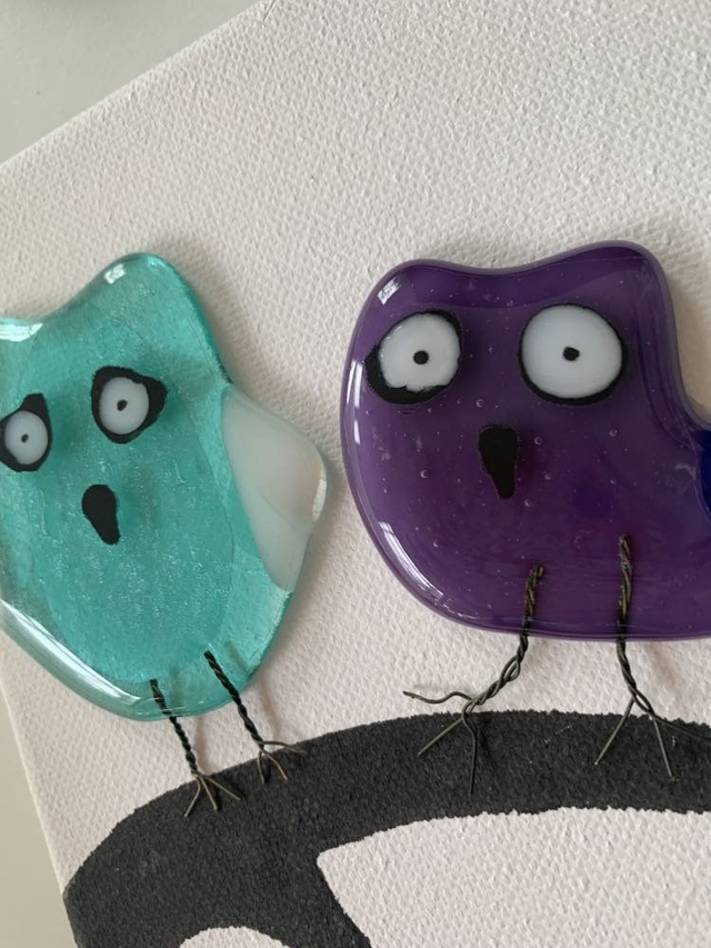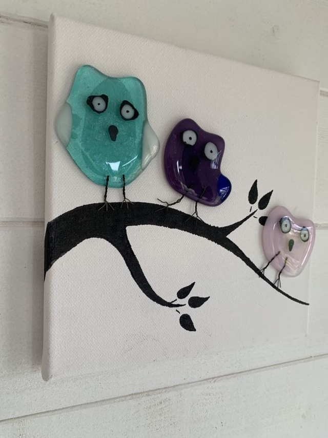 Beautiful hand crafted full fused glass birds on a branch picture on canvas. These birds are an homage to an original drawing by Aurora. They are lovingly crafted using coloured glass and glass inclusions, with wire legs. A gift suitable for any occasion that looks and feels amazing, and makes a gorgeous addition to any home.