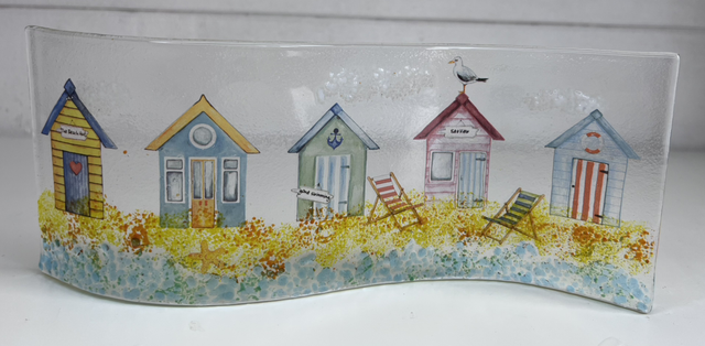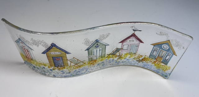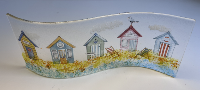 A kiln‑formed glass wave constructed from sheet glass, cut and arranged to create a clean, translucent base suitable for decal and glass frit application. The beach‑hut imagery is produced using high‑fire ceramic waterslide decals, applied to the glass to ensure the design becomes permanently fixed during firing. This piece has been tac fired to retain the additional design elements of clouds, sand and sea to create a cosy coastal scene. Each wave is unique due to natural variations in firing, glass flow, and decal alignment. The pictures shown are representative of the piece you will received in your order.
