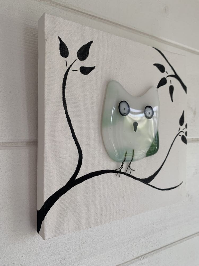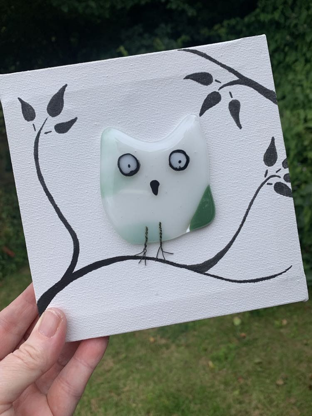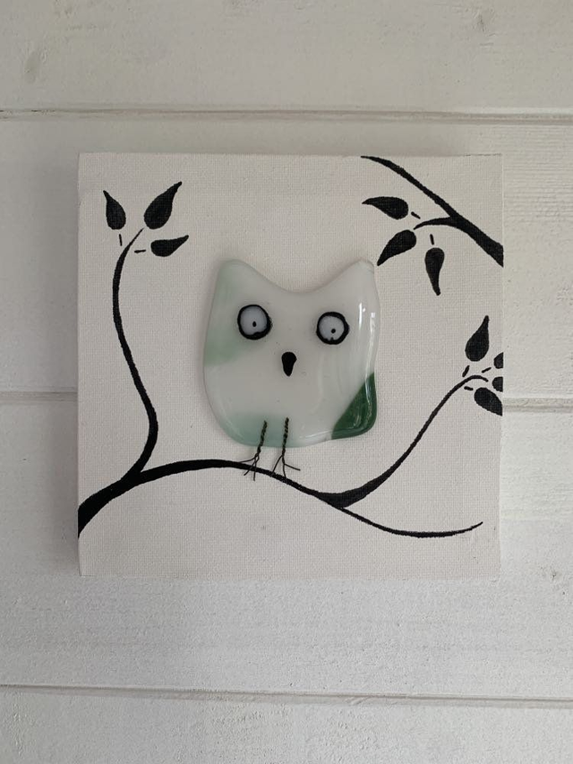 Beautiful hand crafted full fused glass bird on a branch picture on canvas. This bird is an homage to an original drawing by Aurora. Lovingly crafted using coloured glass and glass inclusions, with wire legs. A gift suitable for any occasion that looks and feels amazing, and makes a gorgeous addition to any home.