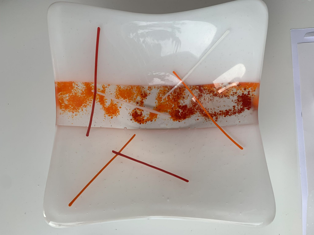 Unusual and unique hand crafted fused glass 14cm square dish in white and clear glass featuring orange and white stringers and frit. A gift suitable for any occasion that looks and feels amazing, and makes a gorgeous addition to any home.