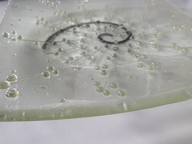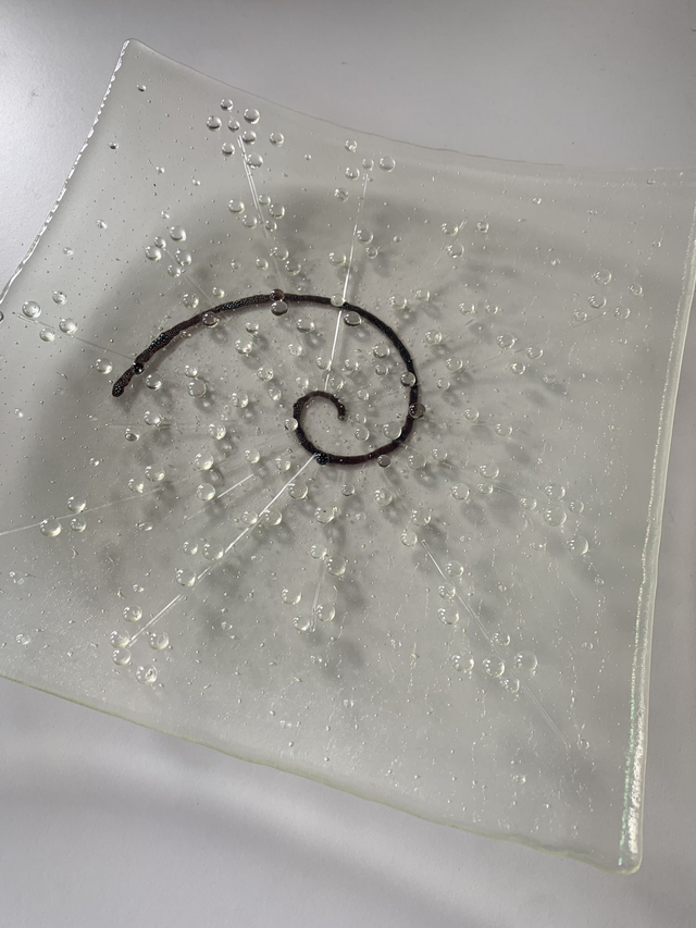 This unique and beautiful hand crafted fused glass plate/serving dish in clear glass follows the Fibonacci sequence. The Fibonacci sequence is a series of numbers in which each number (Fibonacci number) is the sum of the two preceding numbers. The simplest is the series 1, 1, 2, 3, 5, 8, etc. On this plate the sequence is represented and highlighted by the spiral of dark paint bubbles encapsulated in the glass, and also the clear glass 'dots' radiating from the centre.