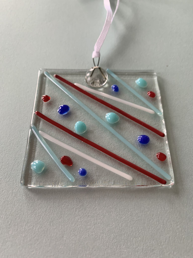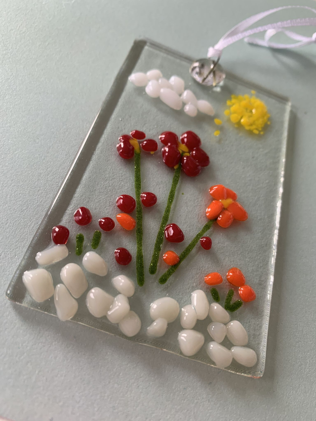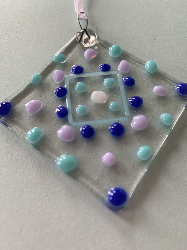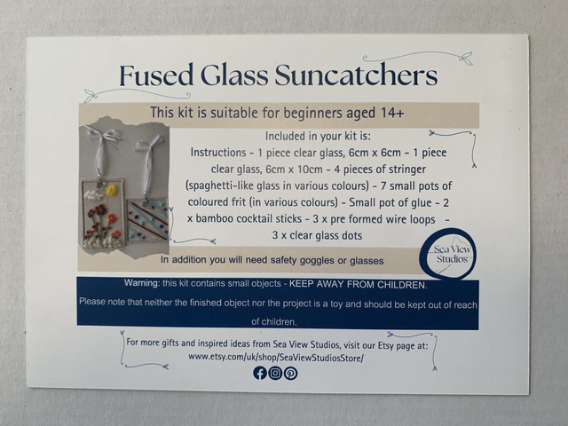 In this kit you have full instructions and sufficient pieces to make 2 fused glass suncatchers. All postage is included in this purchase, along with everything you need to make your very own wonderful fused glass creations. Use the coloured glass inclusions of frit and stringers and glue these to the pre-fired clear pieces in the design of your choice. Glue on the wire hangers and dots, let it all dry and then send it back to us (postage instructions and cost of postage included). We will fire your pieces in our kiln and post them back to you.