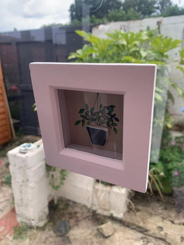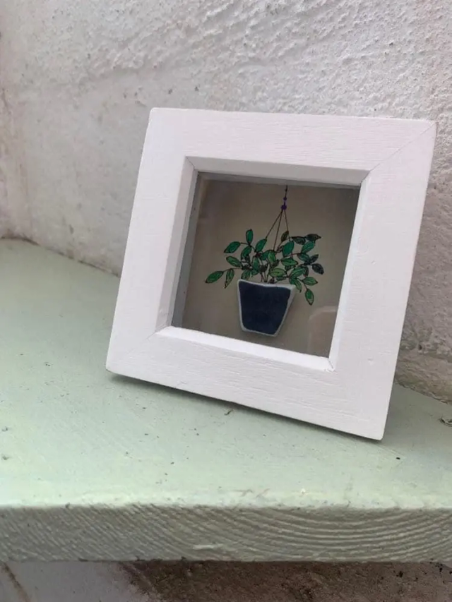 Picture in Deep Frame of Hanging Basket using Found Sea Pottery and Drawn approx. 10.5cm x 10.5cm (230205)