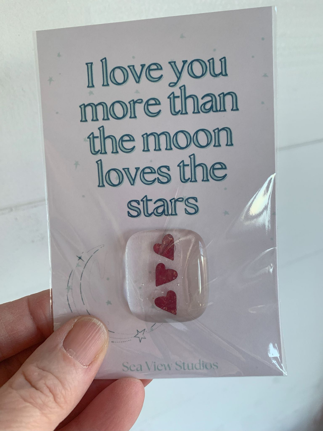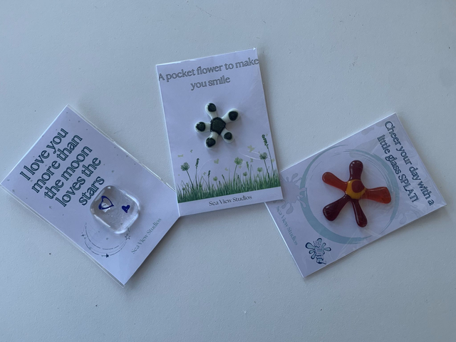 Give a unique piece of pocket sized glass mounted on card with a statement to make you smile. Every one is individual and the item you receive will be randomly selected and sent to you.