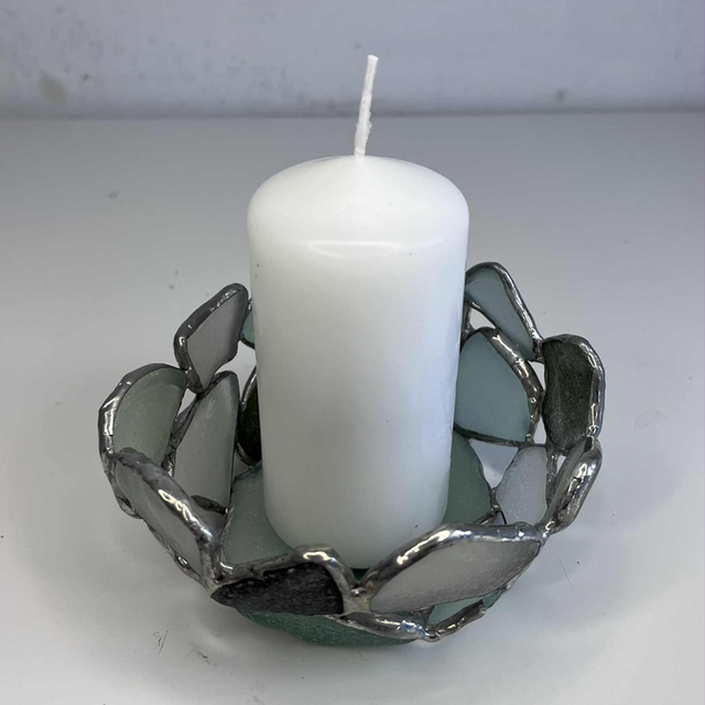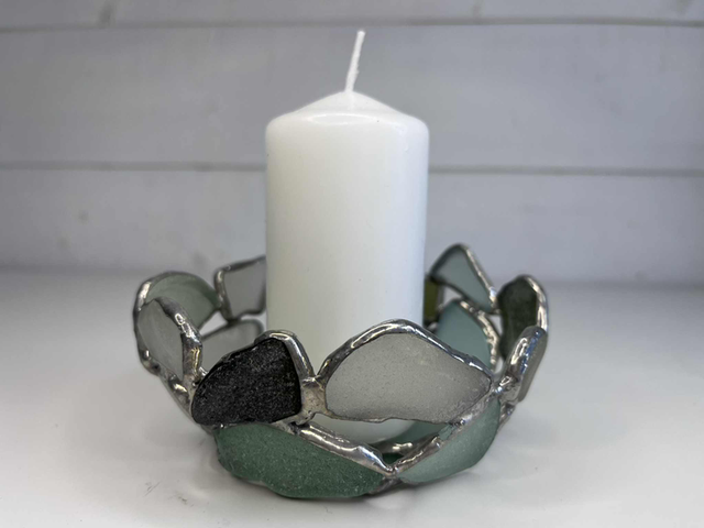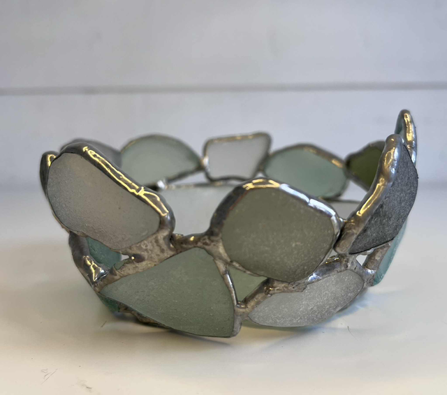 A one‑of‑a‑kind bowl crafted from naturally weathered sea glass, each piece selected for its color, texture, and character. The glass fragments are carefully arranged and soldered by hand, creating a sculptural form that feels both organic and artful. Light plays beautifully through the translucent surfaces, making this bowl a striking decorative piece with a coastal soul.
