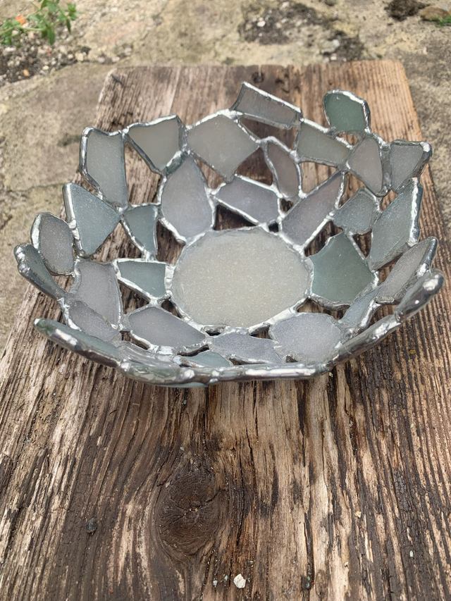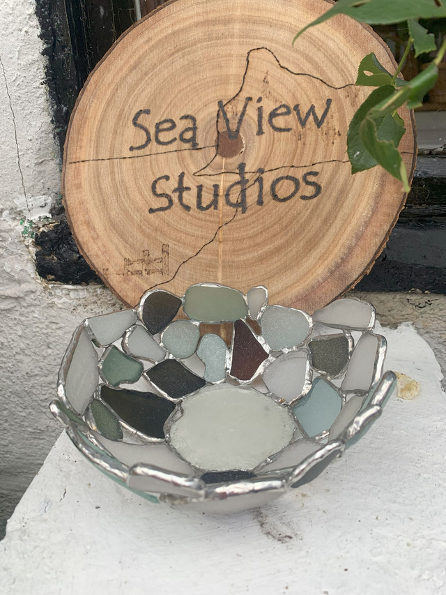 To make a special bowl, each unique piece of sea glass is wrapped in copper foil and soldered together allowing the natural spaces between each piece to highlight the beautiful glass. This piece is guaranteed to be a talking point as sea glass is broken glass naturally recycled by the sea and returned to us on the beach, beautifully shaped and textured. As you examine your bowl, imagine the story each piece could tell you. Just beware of the occasional sharp corner! The pictures shown are representative of the bowl you will received in your order but due to the unique nature of each piece of sea glass, yours may be different.