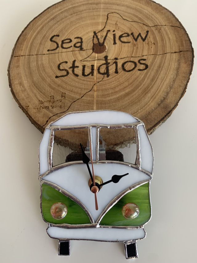 A classic reinvented as a highly collectable and cute hand crafted coloured glass wall clock in white and green glass, copper foiled and soldered. With black clock hands and battery operated. AA battery is included. This item is completely individual and one of a kind. It is unique, a wonderful talking point and makes a gorgeous addition to any home or a very special wedding or anniversary gift. This clock may be dispatched with the hands removed to prevent them bending during transit. Instructions on placing the clock hands will be included.