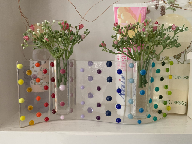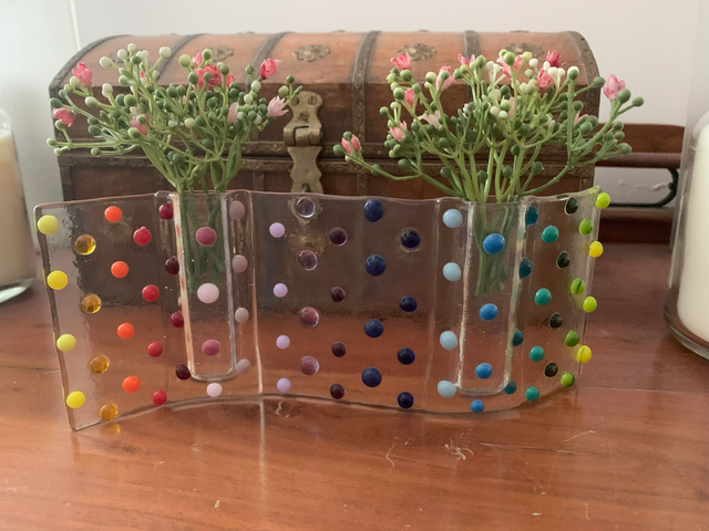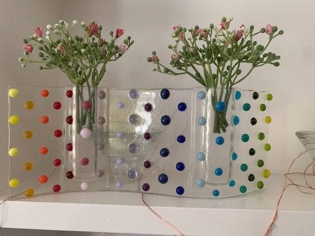 Beautiful unique hand crafted fused glass free standing wave with two small bud vases, decorated with coloured dots. A gift suitable for any occasion that looks and feels amazing, and makes a gorgeous addition to any home.
