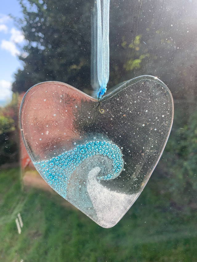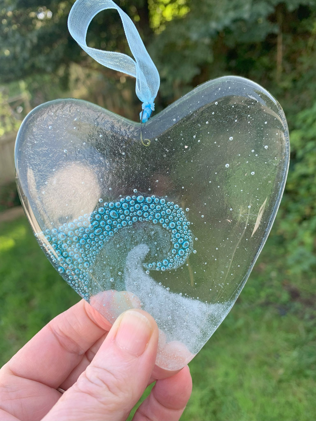 Wave Heart Suncatcher Gift Full Fused Glass approx. 9cm