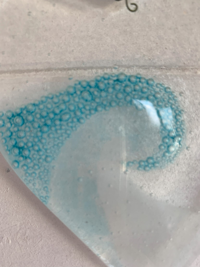 These fused glass items are made in our studio overlooking the Devon coast, using two layers of 3mm Bullseye glass and fully fused to create a smooth and tactile finished piece. A lovely item to look at and to hold, threaded with organza ribbon to complement the elegant desig
